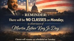 Reminder: There will be no classes on Monday in observance of Martin Luther King Jr. Day. Classes will resume as scheduled on Tuesday.